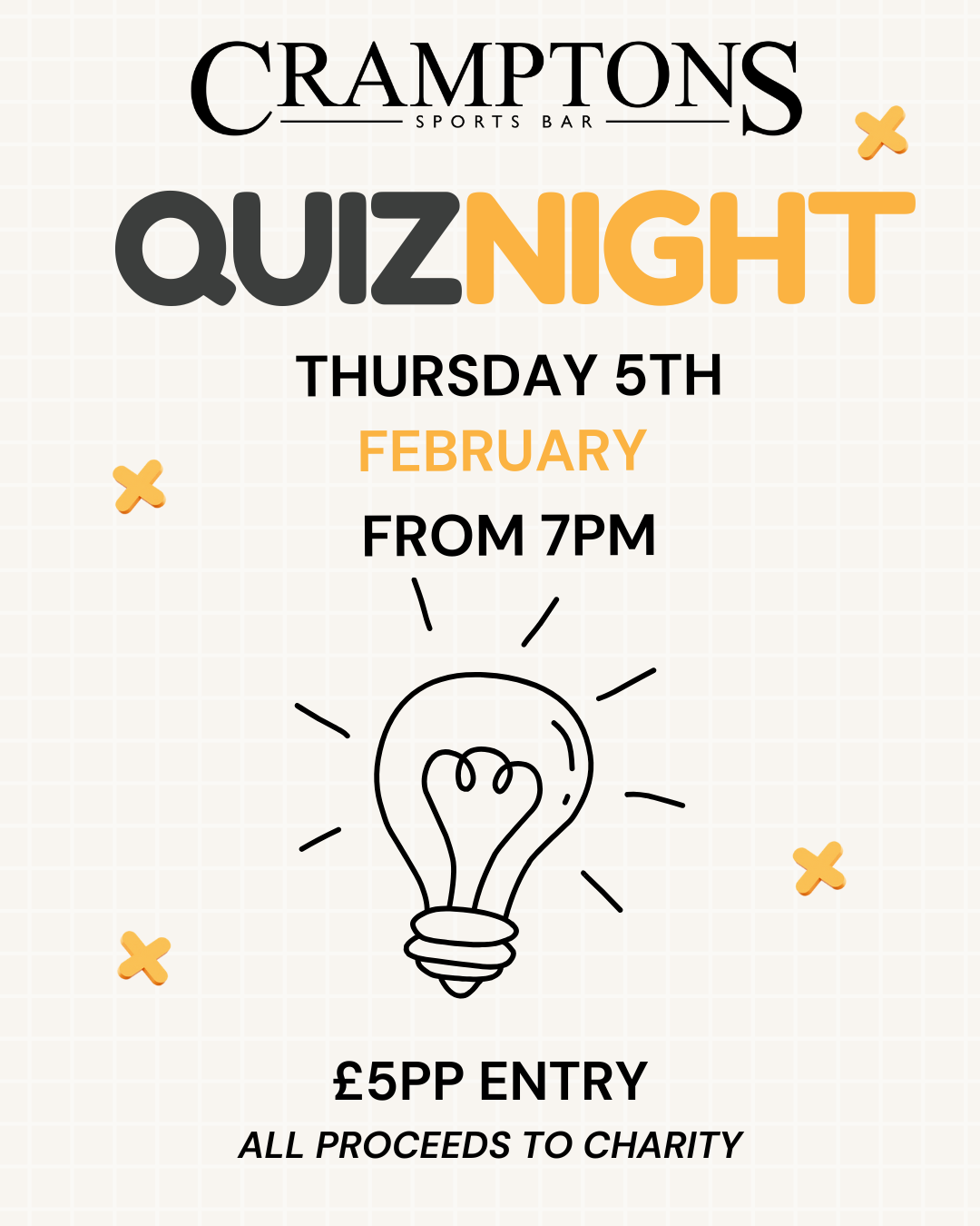 Join us for our fun quiz in aid of The Pilgrims Hospice. £5pp with maximum teams of six. Prizes on the night, food served till late. Book now via the link below or email us at cramptons@thorleytaverns.co.uk.